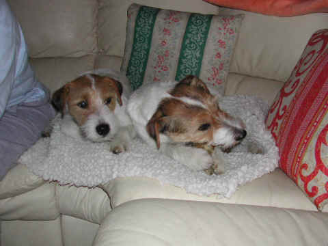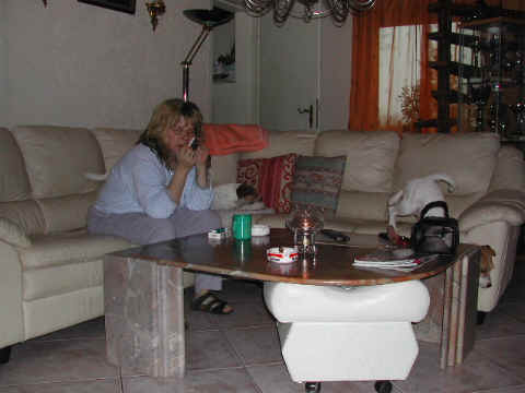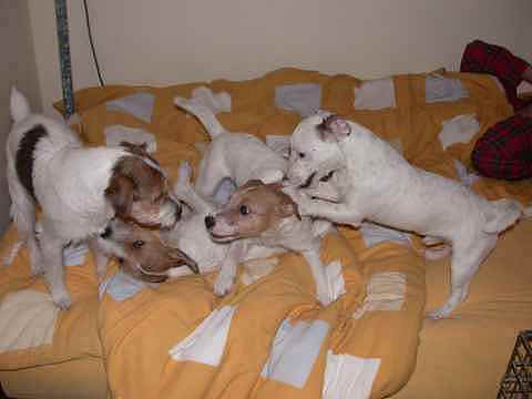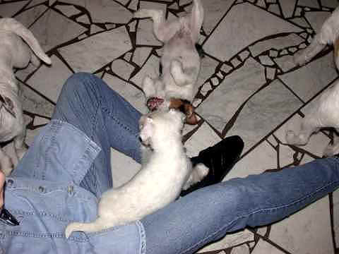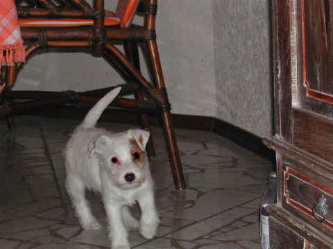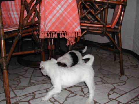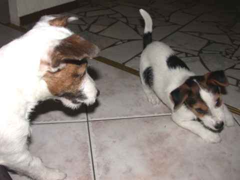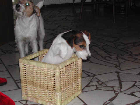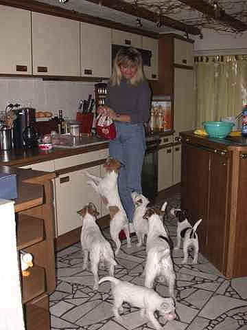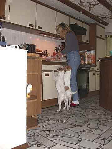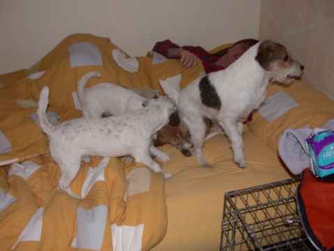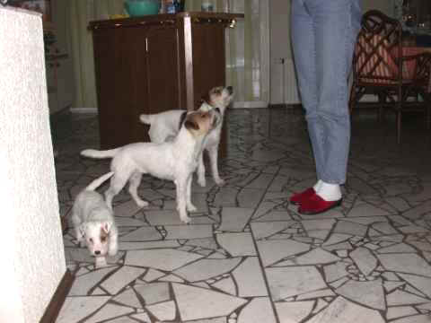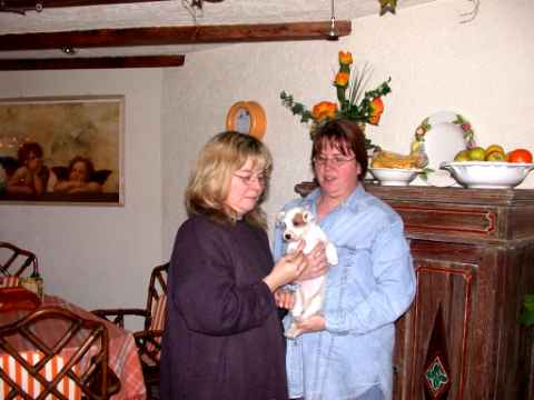 Angel und Donna:"Dieses Wochenende haben wir eine ganz lange Reise gemacht, wir sind nach Berlin zu Beate Degner gefahren. Unser Frauchen hat viele Taschen gepackt und unsere große Autobox auf der Rückbank verstaut, nicht im Kofferraum wie sonst, das war sehr sonderbar. Ab ging es auf die Autobahn, wir machten noch mal ein Nickerchen, denn autofahren ist ziemlich langweilig." Nach kurzer Zeit erreichte ich das erste Ziel und stieg aus. Als ich zurück kam , mußte ich erst mal meine zwei Monster beruhigen, denn ich war nicht alleine, Lucky , Johnny und Annett waren dabei, auch mit viel Gepäck. Blitzschnell war alles verstaut und das kleine Auto war total voll. Los ging die Fahrt. Donna und Angel haben sich sehr gefreut, daß sie in Begleitung fahren durften ! Die Fahrt war aber ganz schön lang und wir waren echt froh, als wir in Berlin ankamen. Die Begrüßung war super und dort roch es so toll nach anderen Hunden, zuerst tobten die Hunde aber dort mal durch den tollen Garten, wir waren ja alle ganz steif von der Fahrt, Zwei- wie auch Vierbeiner. Bald lernten wir die anderen Hunde kennen, am meisten mochte Angel den kleinen Konrad, den sie gleich adoptieren wollte und dann auch verteidigte, es war ganz schön was los , so viele Hunde auf einem Haufen. Mir gefielen natürlich alle Hunde und ich hätte gerne ein paar mit nach Hause genommen. Nach dem wir die vier hundemüde ins Bett geschickt hatten (wir durften mit Johnny und Lucky in einem Bett schlafen), haben wir uns noch mal in Schale geworfen und haben uns mit Beate und Walter ins Berliner Nachtleben gestürzt. Sehr viele interessante Sachen haben wir noch gesehen, womit wir gar nicht gerechnet haben, es war ein super Abend, so viel hab ich schon lange nicht mehr gelacht. Wir haben uns dann noch zu den Vieren ins Bett gequetscht, aber viel Platz hatten wir nicht (Lucky hat sich so breit gemacht, das wir glaubten eine Dogge würde im Bett liegen) und so schliefen wir sechs dann bis morgens um neun Uhr. Wir sind dann aufgestanden und haben erst mal alle Hunde durch den Garten toben lassen und dann hat Beate für uns alle Frühstück gemacht, man das war echt ein super Service für uns und unsere Hunde !!!!!!!!! Anschließend haben wir dann noch einen Trimmkurs bekommen und einige andere super Tipps, dann hieß es leider auch schon bald wieder Abschied nehmen und hier war dann auch der Grund der Reise klar, wir haben nämlich noch ein kleines Parson Mädchen mitgenommen, Snowflake So Nice of sweet Surprise. Wir haben natürlich wieder viele Bilder gemacht und die könnt Ihr hier gleich anschauen.