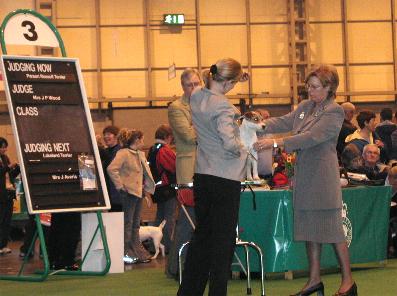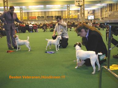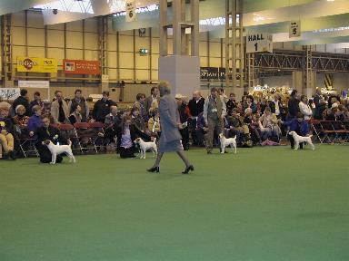 Meine Ortsgruppe hatte Ende letzten Jahres die tolle Idee, doch gemeinsam zur Crufts zu fliegen. Nach langen Planungen und verschiedenen Änderungen waren die Flüge und ein Hotel gebucht und 10 Personen fieberten dem 6.März.2003 entgegen. Endlich war der Abflugstag da, bei Nieselregen flogen wir ab und welche Überraschung, in England begrüßte uns Sonnenschein. Jetzt kam das Abenteuer Auto fahren auf uns zu, 5 Personen pro Auto, einer musste fahren. Schon zu Hause hatten wir ein Opfer ausgewählt, am Anfang standen uns die Haare zu Berge, das Herz war ins Hosenbein gerutscht. Aber ich hätte nicht mit unserem Fahrer tauschen wollen, hier nochmals ein herzliches Danke schön, er hat uns alle wieder sicher an den Flughafen gebracht. Endlich im Hotel war erst einmal Kaffeetrinken angesagt und die Planung des nächsten Tages. Ein Teil der Gruppe wollte sich in der Nähe das Shakespear-House anschauen, ein Anderer , zu dem auch ich gehörte, wollte wenigstens einen Tag London unsicher machen. Morgens früh um 6.00Uhr ging es los, zuerst mit einem Doppeldeckerbus nach Birmingham, von da mit dem Zug nach London. Gleich im Zug stieg eine Engländerin zu, die wir als Crufts-Besucherin identifizierten, denn sie hielt ein Programm der Crufts in der Hand. Mit unserem bisschen Englisch erreichten wir es, einen Blick ins Programm zu werfen, um zu wissen, wer richtete und wie viele Hunde von unserer Rasse gemeldet waren. In London angekommen sausten wir zu Fuß zu einigen Sehenswürdigkeiten, über Trafalgar Square, Big Ben (pünktlich um 13.00 hörten wir den Glockenschlag) und an Westminster Abbey vorbei. In der Downing Street gerieten wir in eine Demo, wanderten über die Westminster Bridge. Viele der berühmten, roten Busse flitzten durch die Stadt und auf dem Rückweg zum Bahnhof kamen wir an einem kleinen Park vorbei, welche Überraschung, er hieß „Russell Square“. Natürlich machte ich gleich mal ein Foto. Total erledigt kamen wir spät wieder im Hotel an und freuten uns auf den nächsten Tag, Terriertag bei der Crufts.